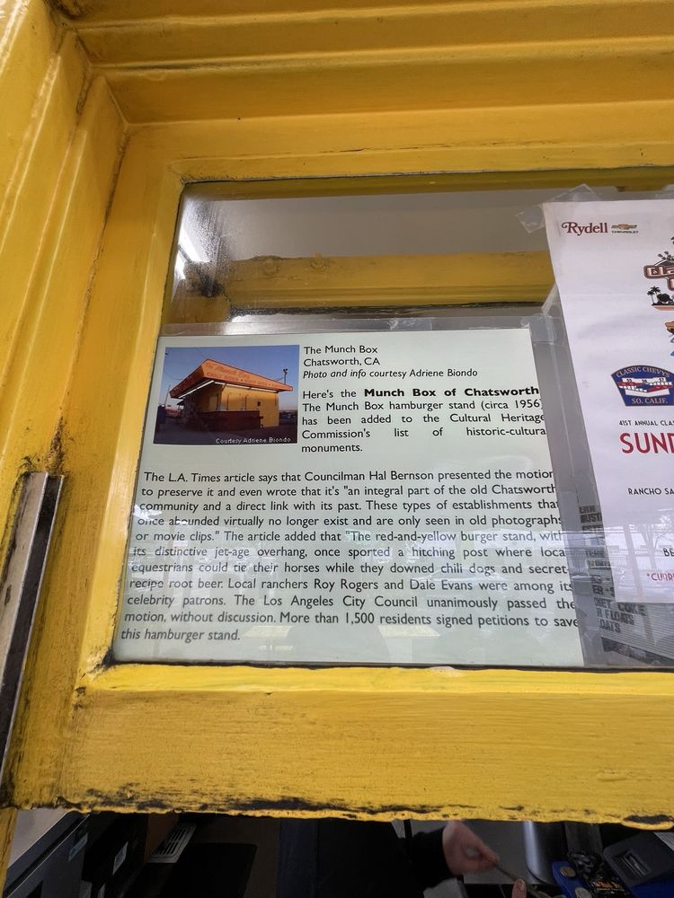 Introducing The Munch Box, a historic burger stand in Chatsworth, CA. Known for its classic burgers, fries, and hot dogs, this spot offers a taste of the 60s with consistently good food at reasonable prices. Customers rave about the friendly service and welcoming atmosphere, making it a must-visit for those craving delicious junk food. The menu, featuring options like the Hickory Burger, Western Dog, and chili cheese fries, caters to chili lovers, but modifications are available upon request. Cash-only payment, ample parking, and a simple yet satisfying menu make The Munch Box a hidden gem in the world of fast food. With a warm welcome, generous staff, and a nostalgic ambiance, this spot is perfect for a casual meal with friends or family. Don't miss out on experiencing the charm and flavors of The Munch Box for yourself.